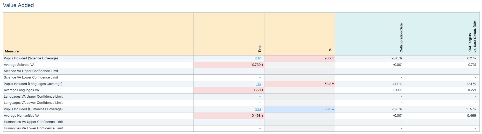 The Value Added section lists the cohort scores in the three EBacc elements that the DfE releases estimates for (Science, Humanities, and Languages).
