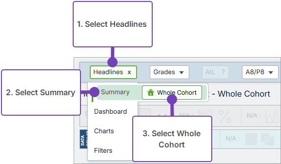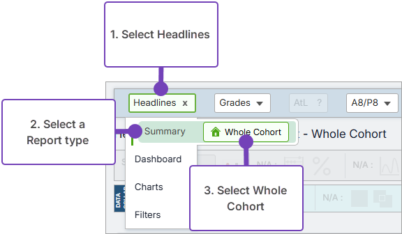 By default, the Summary Report opens. To open one of the other reports, select the Report type (Dashboard, Charts or Filters) for the Whole Cohort from the Headlines menu: