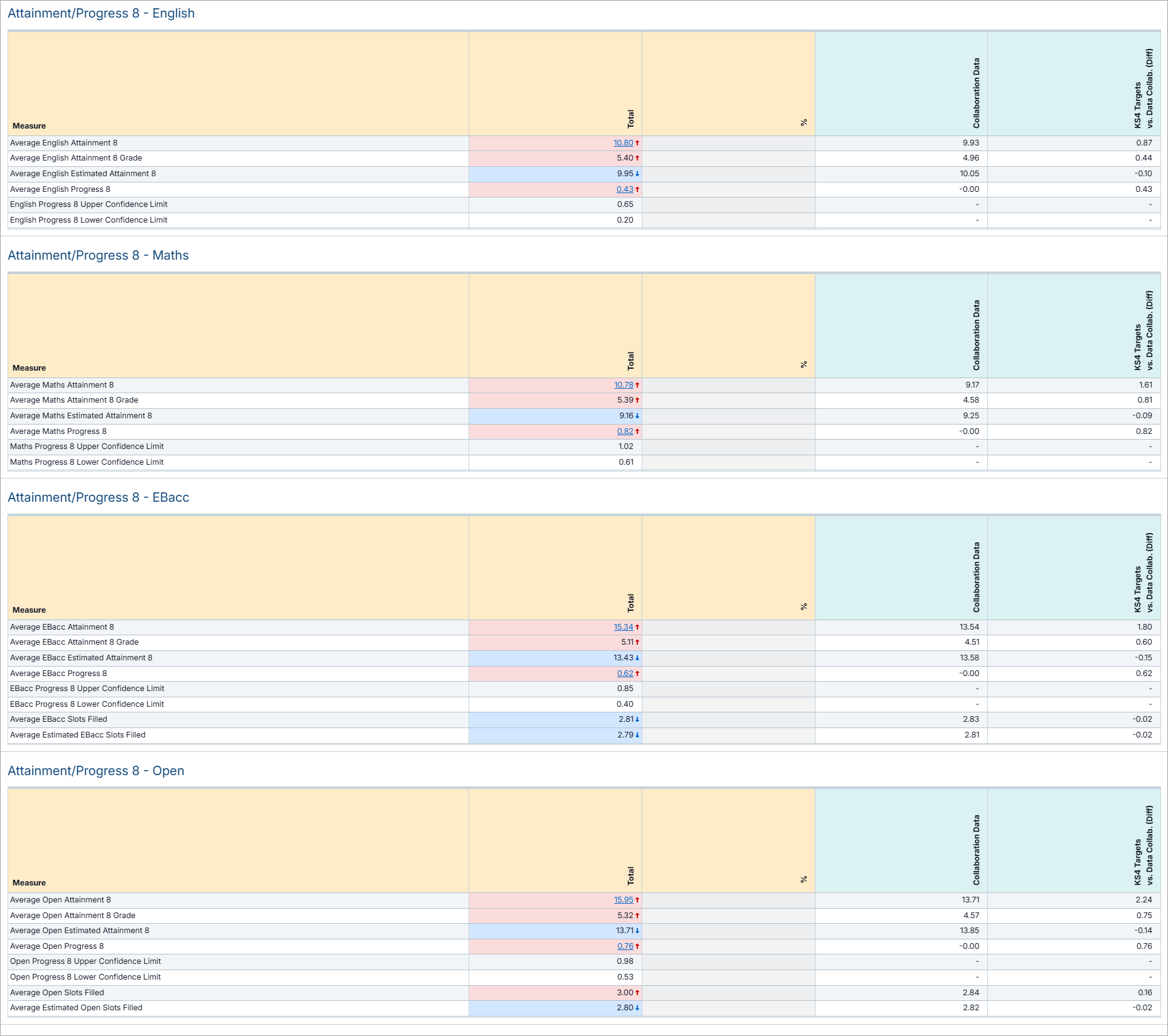 The next section of the report comprises in-depth Attainment 8 and Progress 8 scores for each element. English, Maths, the EBacc, and Open figures are included, as these are the elements the DfE provide estimates for each year.