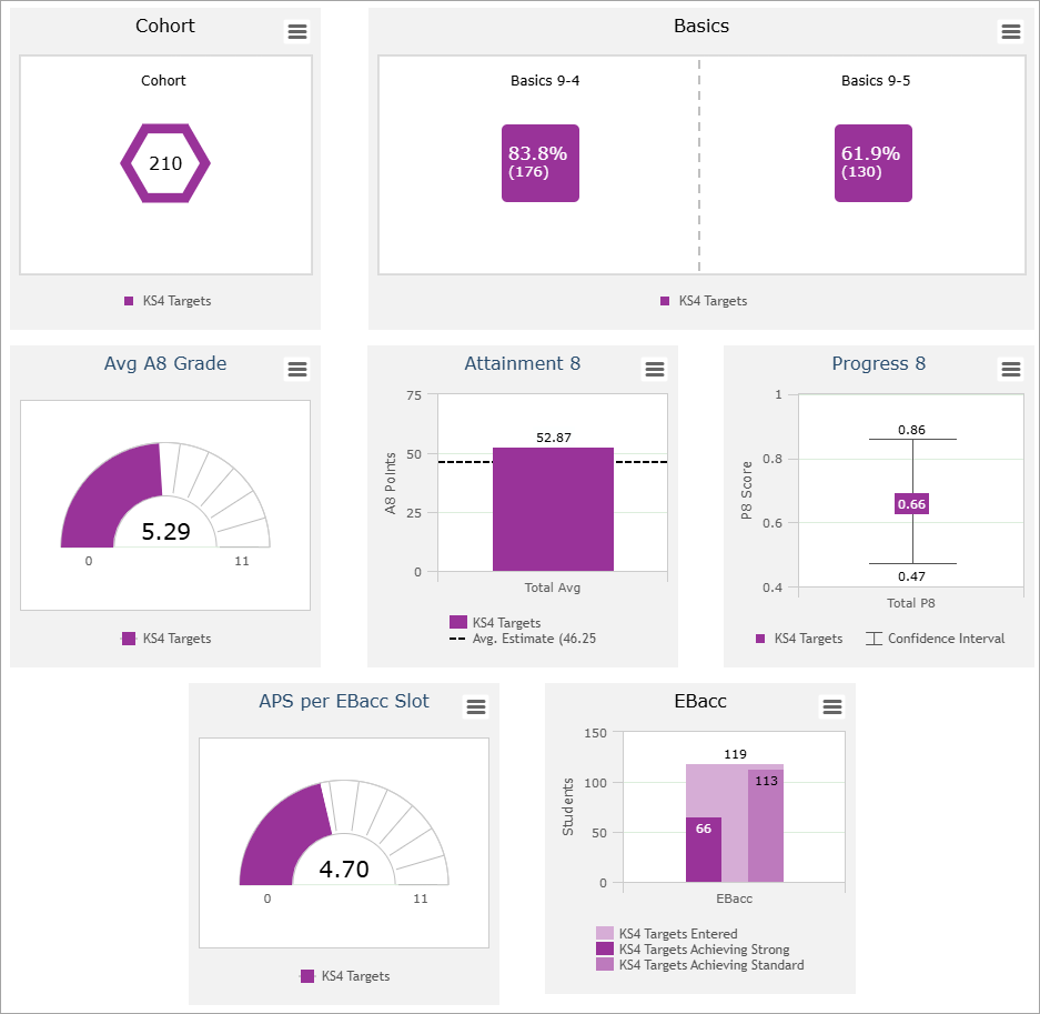 TheDashboard provides an overview of official headline figures as a series of widgets/charts, for example, Basics, Attainment 8, and Progress 8.
