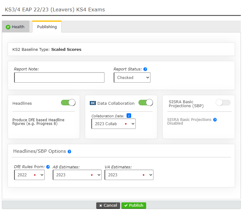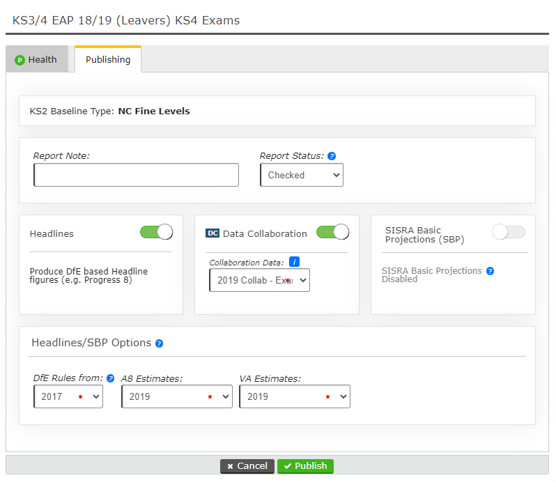- In the Publish Window select the correct set of Attainment 8 and Value Added estimates for the cohort, dependent on their selected KS2 Baseline Type.