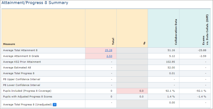 This article explains how to troubleshoot why Progress 8 scores are showing as a blank (-) in reports as shown below:
