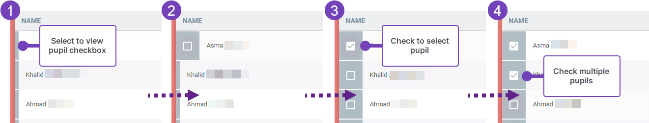 - To select one or more pupils select the bar to the left of a pupil's name and check one or more pupils: