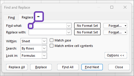 - Enter "-" in Find what:, and make sure Replace with: is left blank: