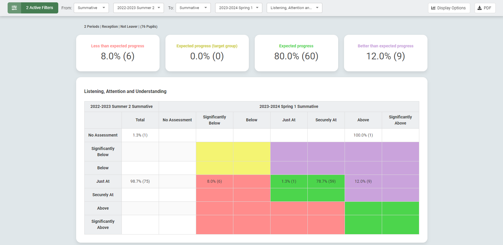Each cell (element) within the matrix lists the number and percentage of pupils achieving that assessment outcome. The total percentage value is based on the total number of pupils in the group. For the other cells the percentage value is based on the total number of pupils achieving the "from" assessment outcome. In the example below, this is the Just At outcome: