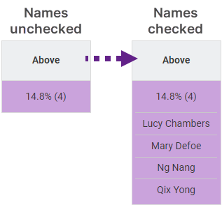 Check / uncheck the following to control how the report is presented: Check to view the names of the individual pupils whose results make up the totals shown in each of the cells in the report: By default, Names is not checked.