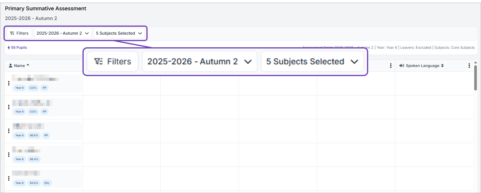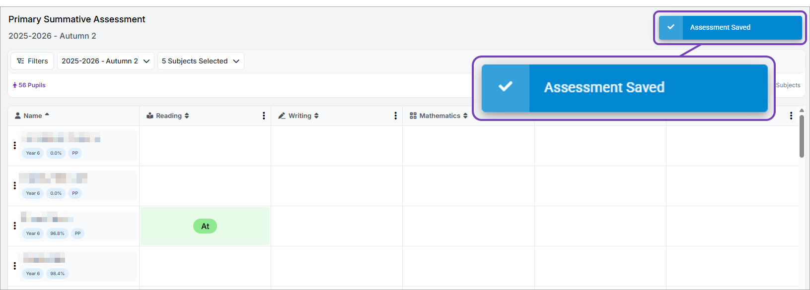 When you select a code, the pupil assessment is saved: