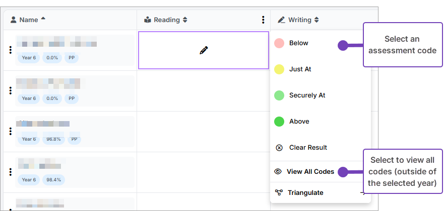3. If you selected View All Codes, select the code from those displayed the pupil you are assessing. This allows you to set assessment codes for pupils who are working at a different level to their current year group: