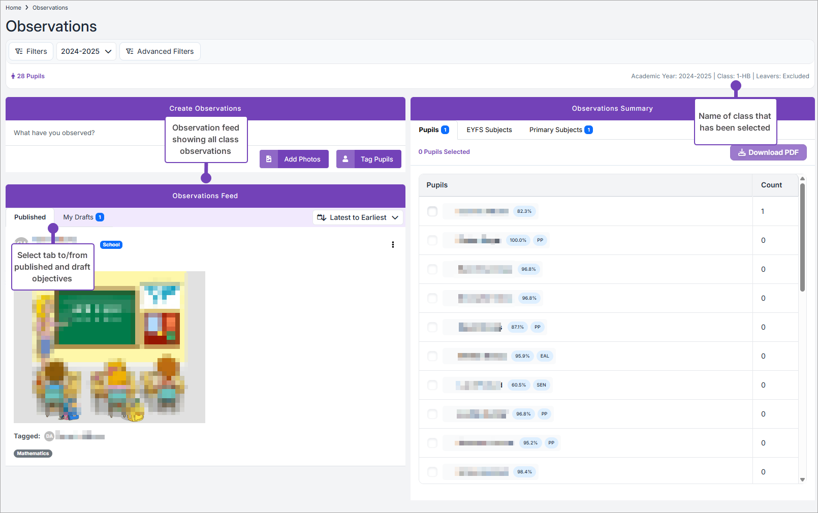 - If prompted, select the year groups and/or classes for the pupils you wish to observe (you can select more than one of each as needed) then select Open Observations: