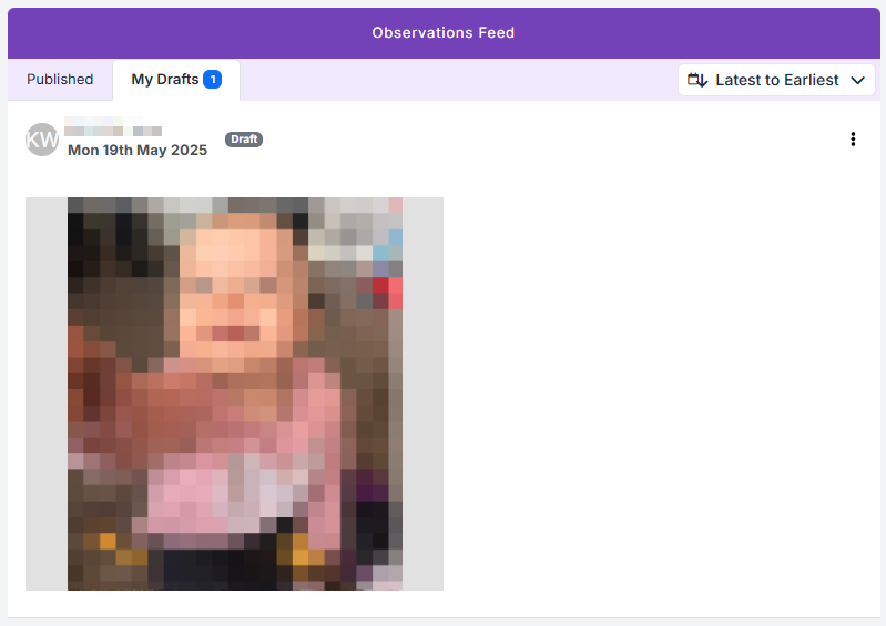 The My Drafts tab within the Observation feed is displayed. This shows all of your draft observations across all of your classes/year groups: