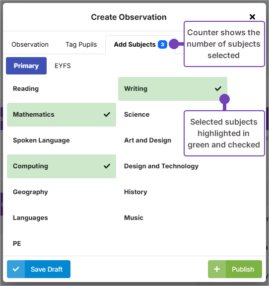 Select the Subject(s) for your observation (tab between Primary and EYFS subjects/strands as needed).
