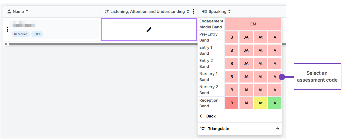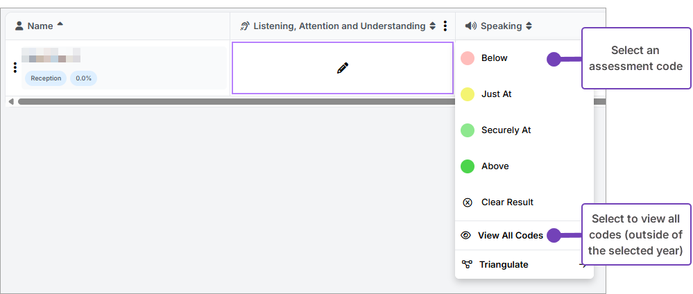 Select the appropriate assessment code for the pupil that you are assessing or select View All Codes: