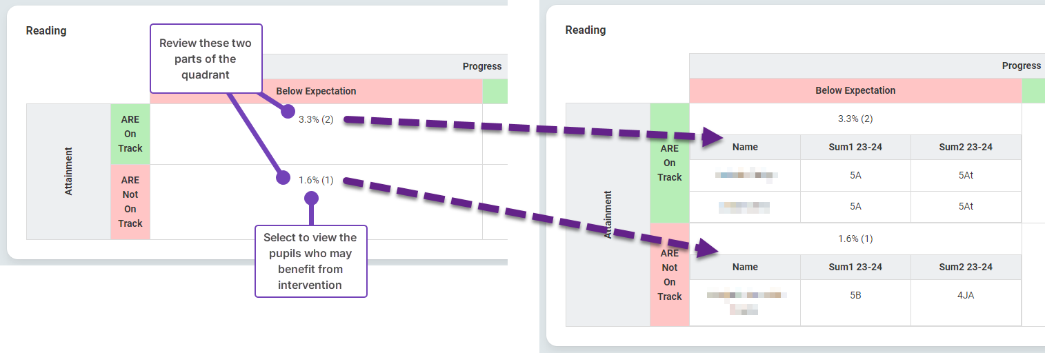 - Initially, look at the pupils in the top left corner of the quadrant. They are on track for their age, but their ARE has decreased from the first to the second period. For instance, a pupil's ARE might be Above their age-related expectation in the first period but has dropped to At in the second. Use your knowledge of each pupil in addition to this information to determine if they would benefit from an intervention.