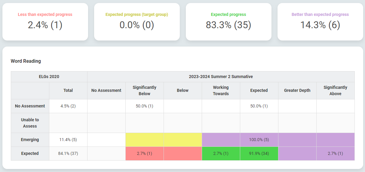 In the example below for a Year 4 cohort, looking at their progress from ELGs, of the 37 pupils who achieved Expected for their ELGs, for their summative assessment at the end of Year 4, 1 is working significantly below their ARE, 1 is working towards (Just at), 34 are working at the expected level and 1 pupil is significantly above ARE: