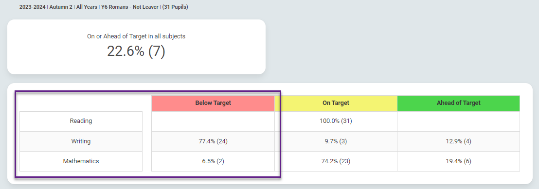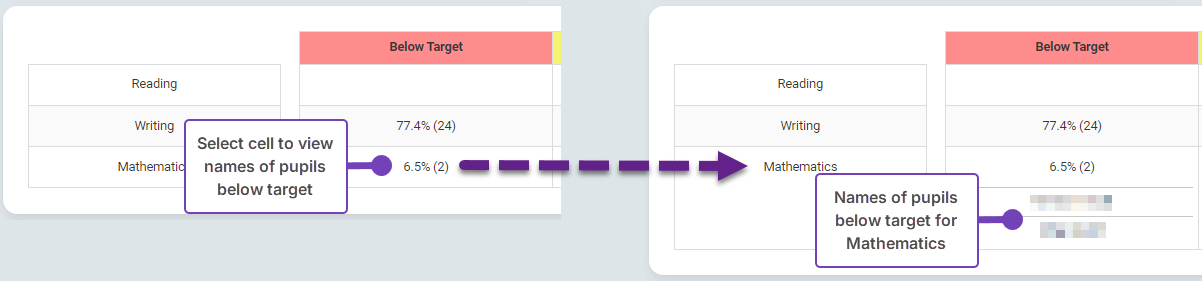 - Where the percentage and number of pupils exist for a subject, select the cell to view those pupils Below Target: