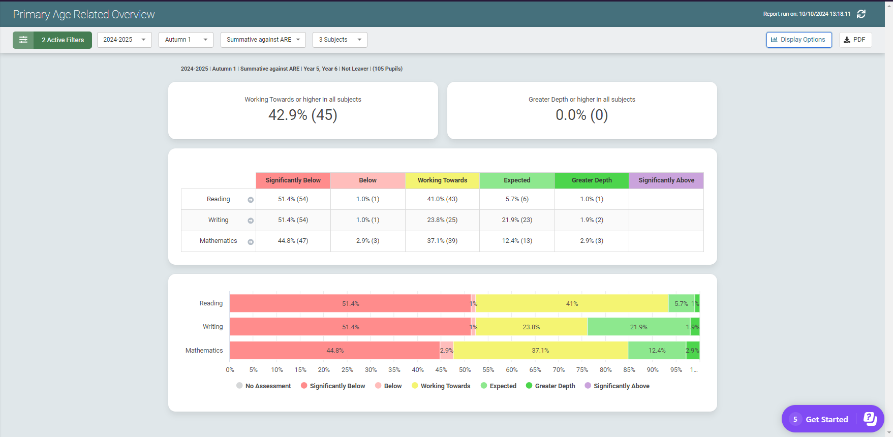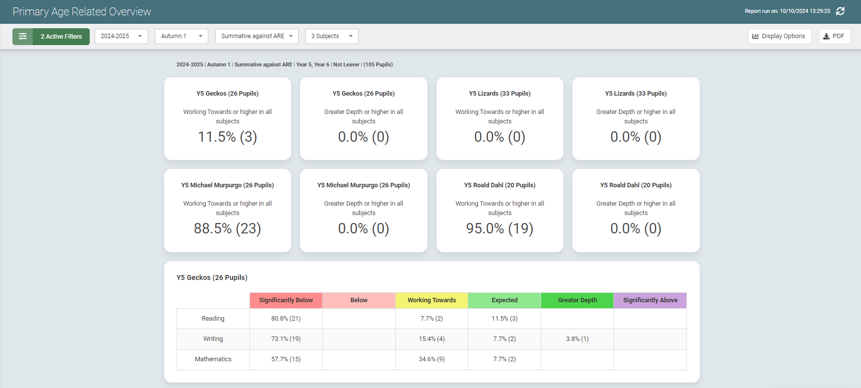 - Select Load Report. This opens the Age Related Overview report in its default view viewing the data for all pupils across the selected years/classes (for this example, the Primary Age Related Overview report is used):
