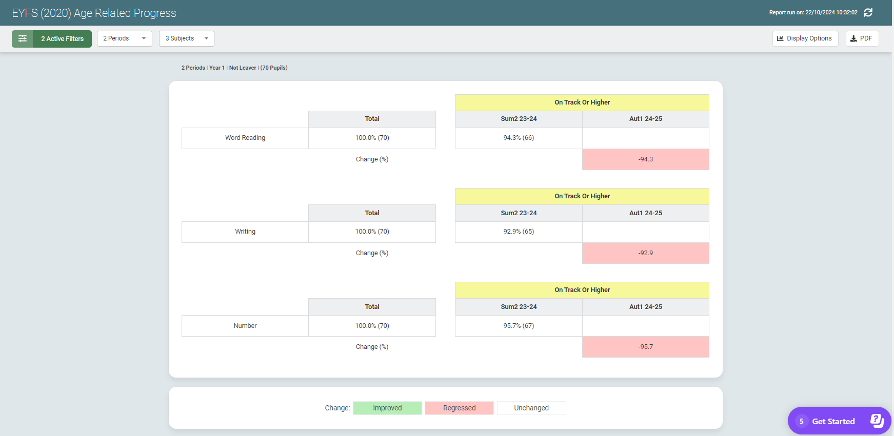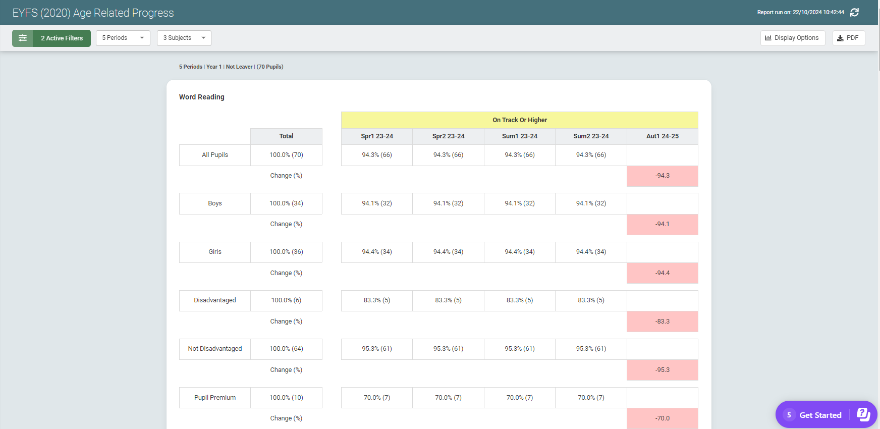 Using the report, you can compare the proportion of pupils On Track or Higher for each group and how they have changed over the selected assessment periods.