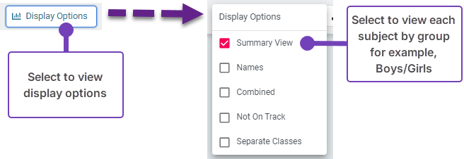 To view the progress of those not on track, Select Display Options and select Not on track.