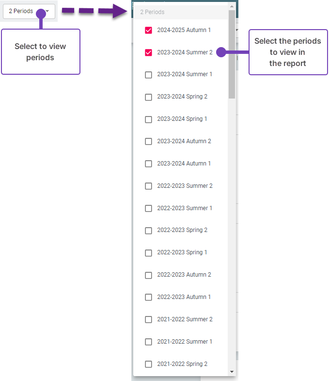 - Select the assessment periods to include in the report - these are the periods that you want to show progress across: