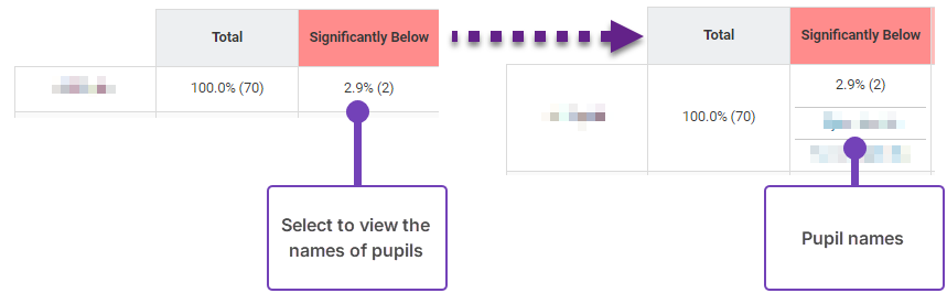 For each subject displayed, you can compare the performance of your Disadvantaged pupils with other pupils. For each measure, the percentage and total number of pupils is listed. Select a percentage/number to see a list of the pupils included in the value:
