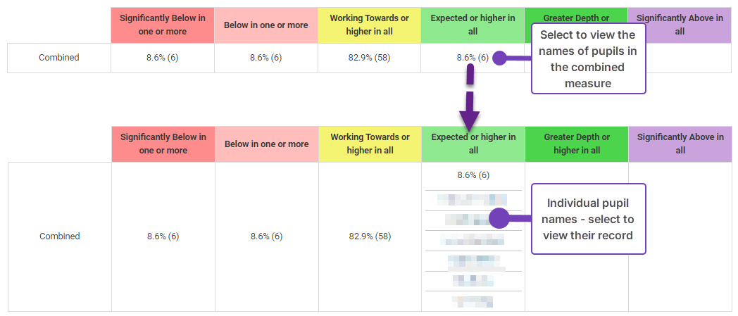 Scroll down to the Combined section of the report. These values show how pupils are performing compared to their ARE. For each measure, the total number of pupils is listed. Select each combined value to see a list of those pupils making up the measure. Anyone who is Just At or higher through to Significantly above is on track for Combined RWM: