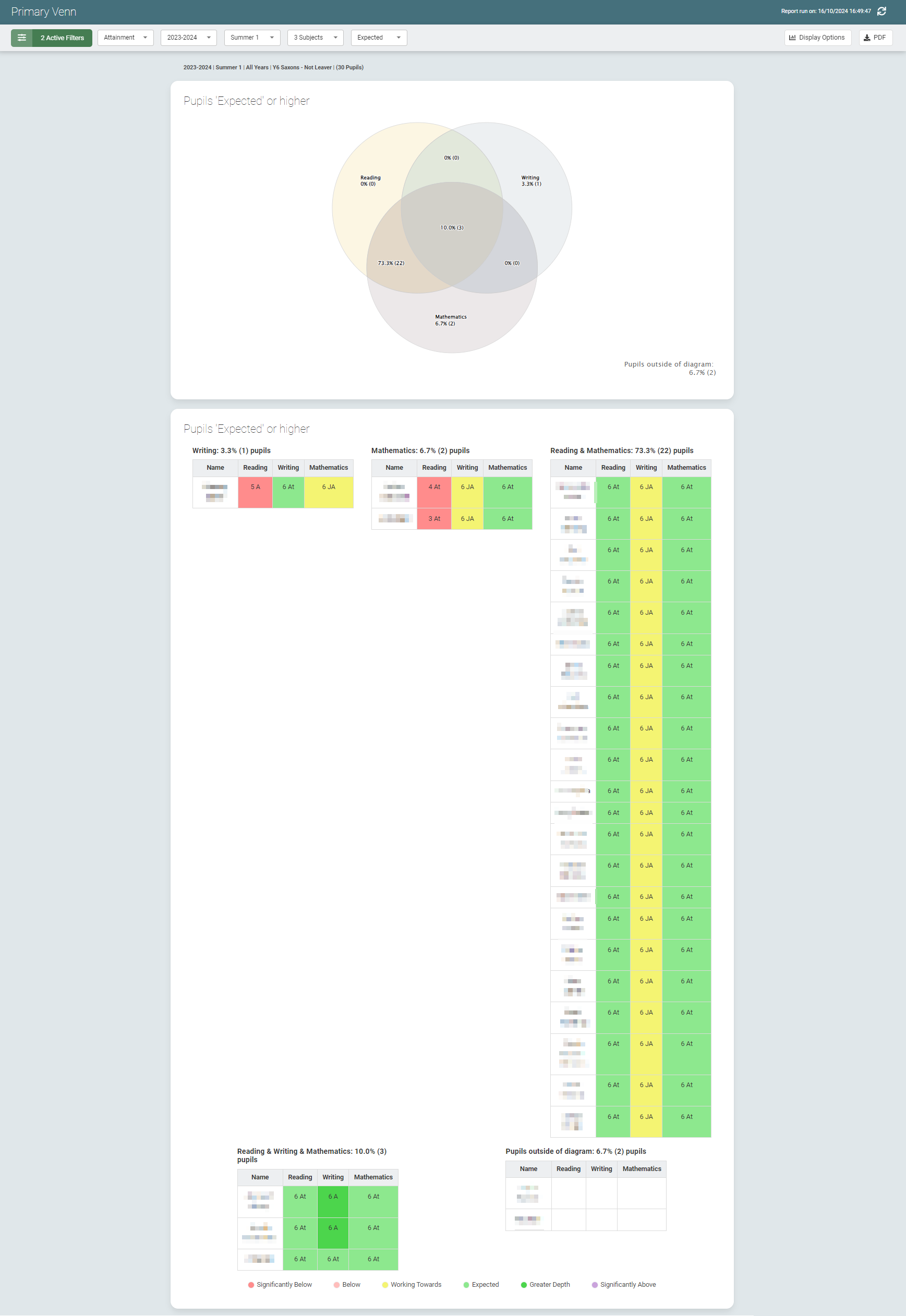 The report is displayed showing those working at the expected level or higher for Reading, Writing and Mathematics as both a Venn diagram and in tabular form. Review the tables to identify pupils within each of the subjects/subject intersects: