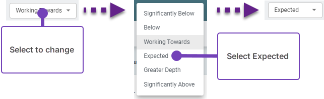 • To view those pupils who are working at the Expected level or higher, select Working Towards and select Expected: