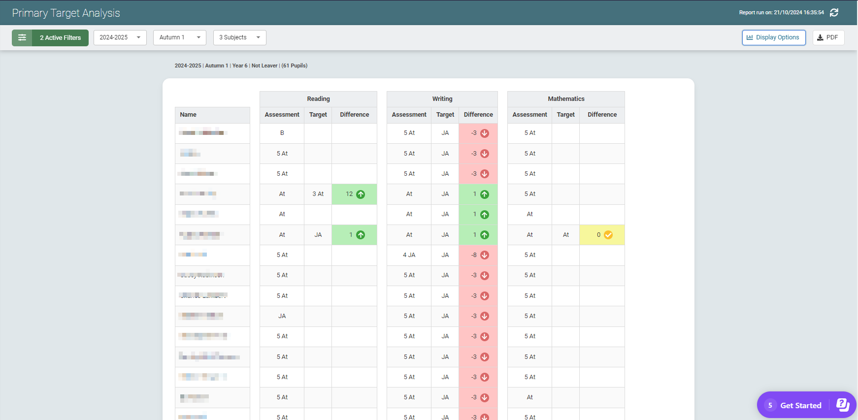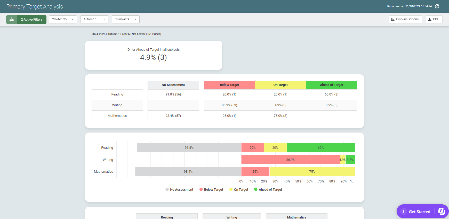 This article explains how to use the Primary Target Analysis report to identify those pupils who are not on track to meet their targets in the individual subjects that make up Combined RWM. Using the report you can view each pupil's performance compared to their target for each of the three individual subjects.