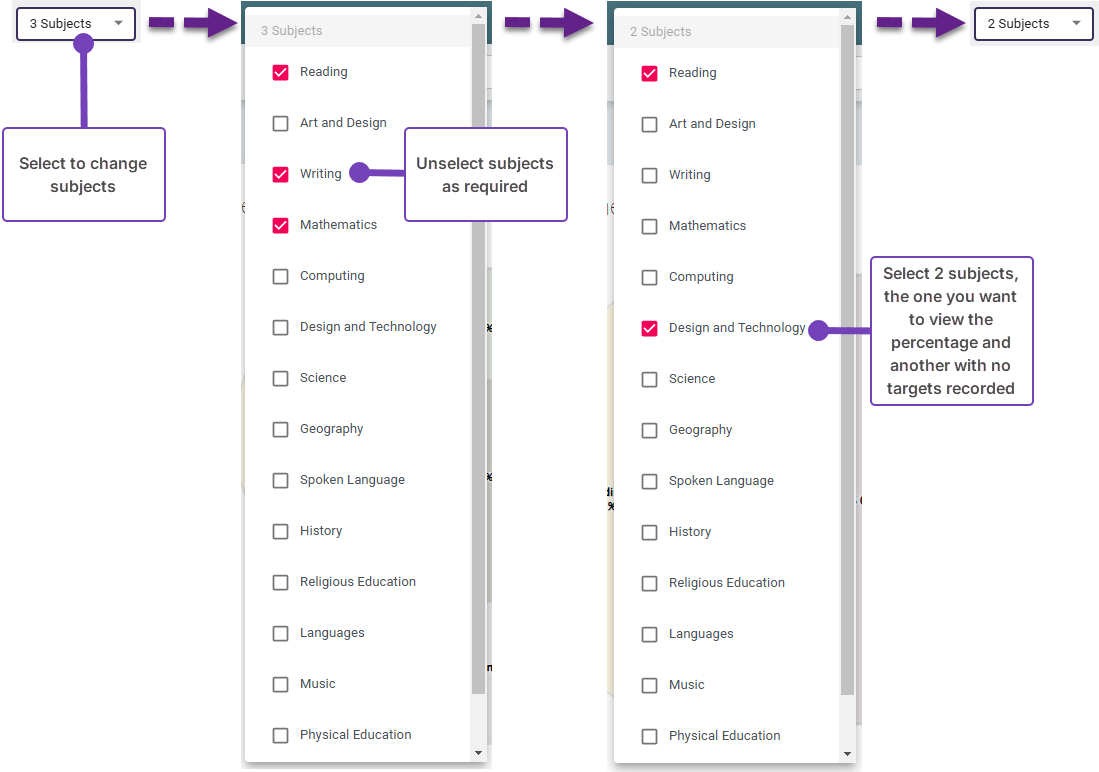 Select two Subjects - one for which you want to see the percentage (for example, Reading), and another without any assigned targets (for example, Design Technology). This simplifies viewing the required subject's percentage: