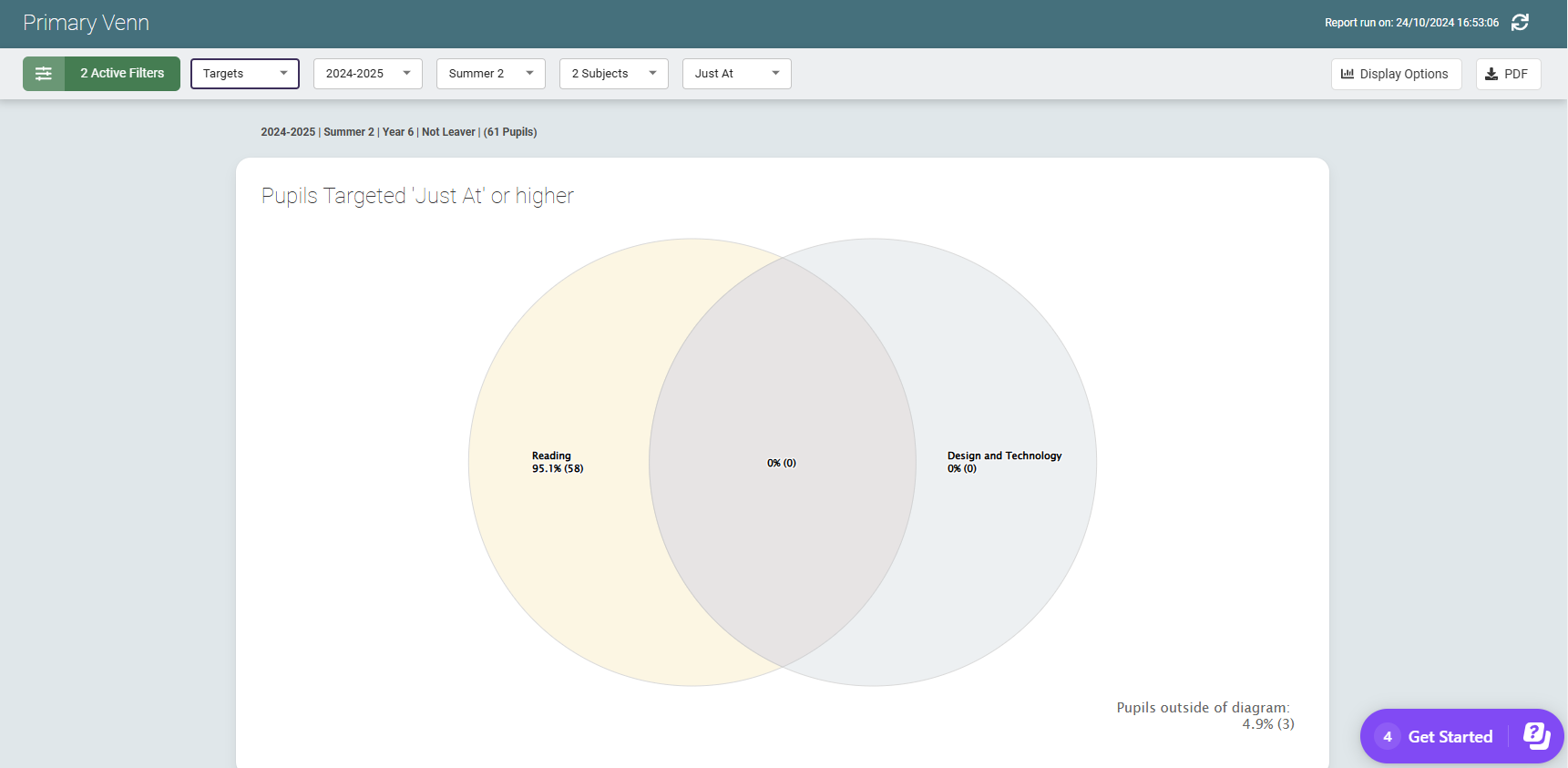 This article explains how you can see the percentage of pupils targeted to At (Just At or Higher) for a single subject using the appropriate Venn diagram report for your pupils (Sonar Tracker: EYFS (2020) Venn Report or Sonar Tracker: Primary Venn Report).