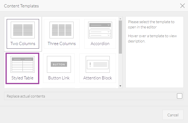 - The Content Templates window opens. Select Styled Table: