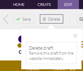- A warning confirming that you are about to delete a draft is displayed. If you are deleting a draft of a live page, deleting the draft will leave the existing live page as it is on your website: