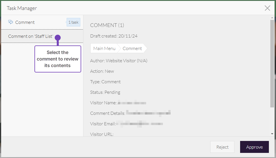 This article explains how an administrator can review and approve comments left by visitors on the pages of your website before they are published. When a visitor leaves a comment it will be saved and a notification will be sent to an administrator to approve the comment. The approval task contains all submitted information, properties of the comment and the visitor's IP address.