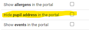 Pupil Asset: How to remove the pupils address showing in the parent portal Admin > school options > parent access > tick the box for 'hide pupil address in the portal' Updated 21 November 2024 12:12 Was this article helpful? 0 out of 0 found this helpful Have more questions? Submit a request
