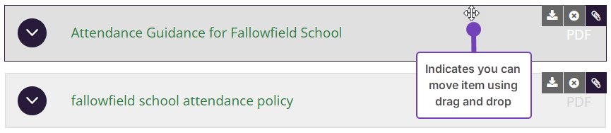 - Manually re-order items using drag and drop - select the attachment to its new position in the list: