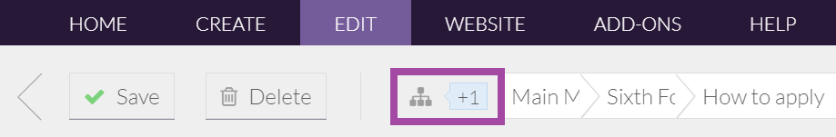 - Select the hierarchy icon from the EDIT tab. You will may see a + symbol and a number, for example, +1, indicating how many additional locations this particular page has on your website: