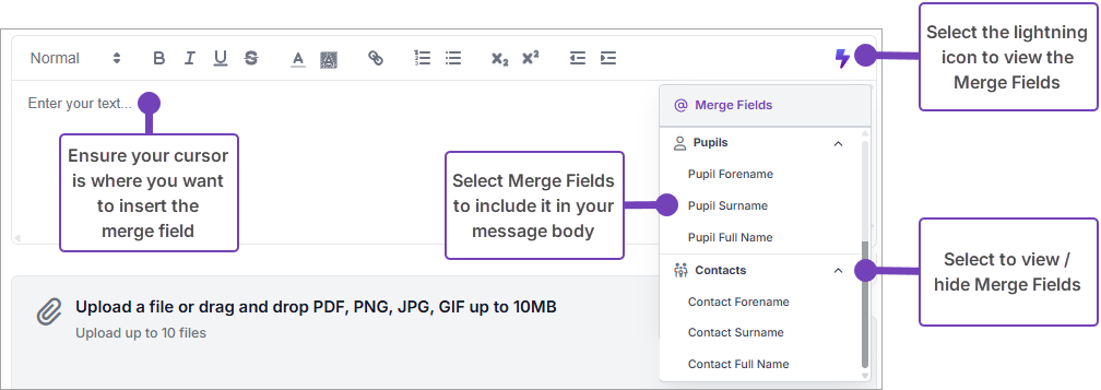 If you want to customise the message in the template, for example, by automatically using the pupils name, select the lightning icon, and select the merge fields you want to insert at the appropriate point in the text: