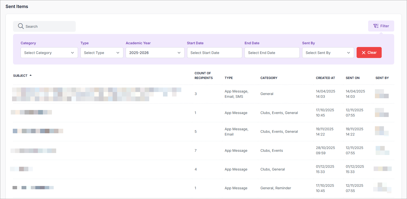 Select one or more Filters to narrow your search by message Category, message Type, the Academic Year that the message was sent, a specific date range (using the Start Date and End Date filters) or who the message was Sent By.