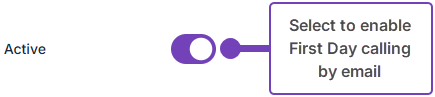 - To enable First Day calling by Email, select Active: