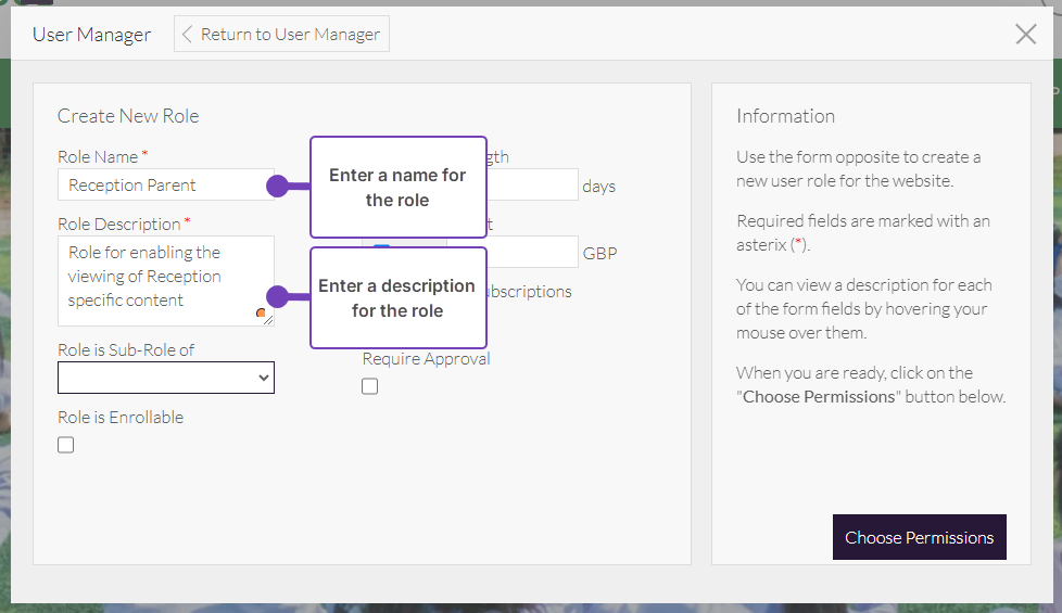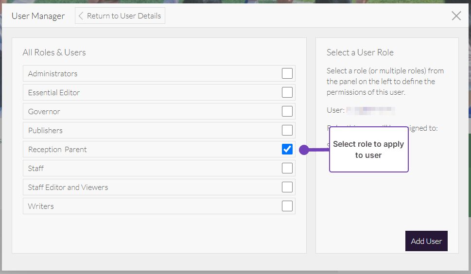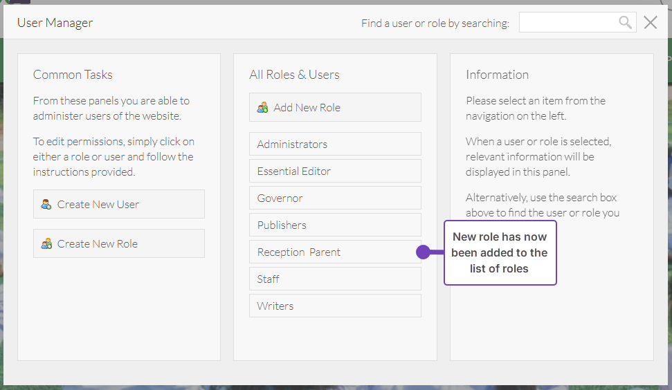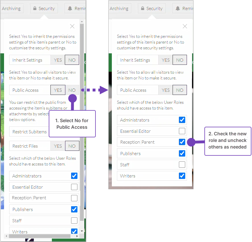 It's good practice to create a generic parent account for each year group/class in your school with an associated role and an associated page (or series of pages), for example: