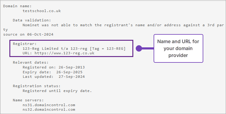 - Locate the Registrar section in the record to see your school's domain provider. In this example, it is 123 Reg: