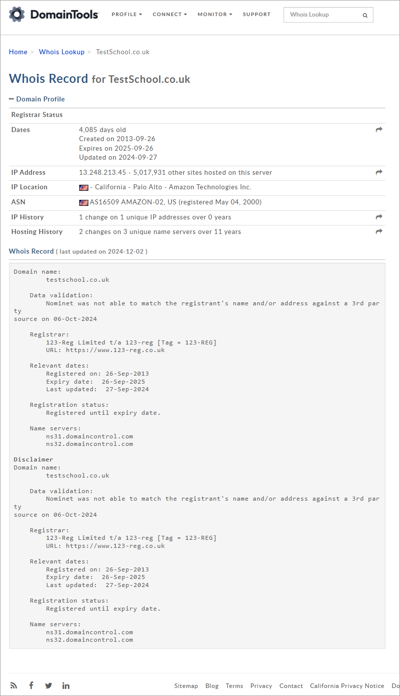 Although we recommend using Whois Lookup on the DomainTools website, we cannot guarantee the accuracy of their information as they are a third-party organisation and not part of Juniper Education.