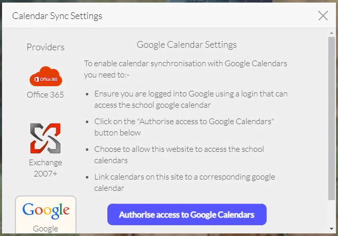 - Select Authorise access to Google Calendars: