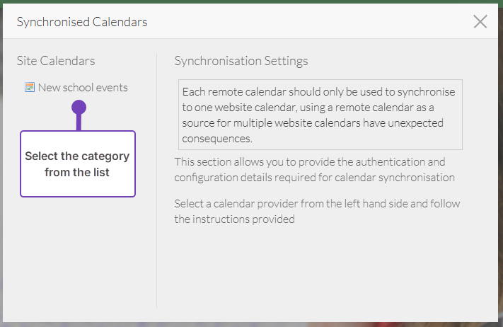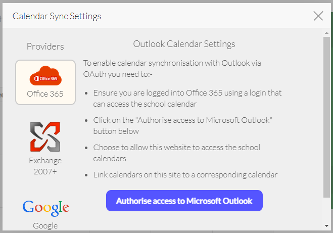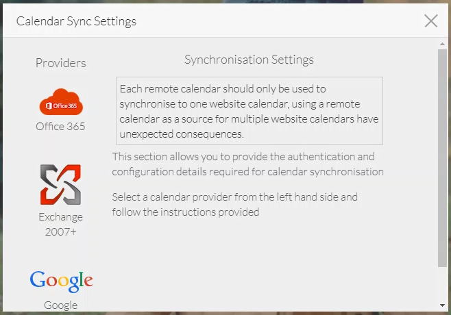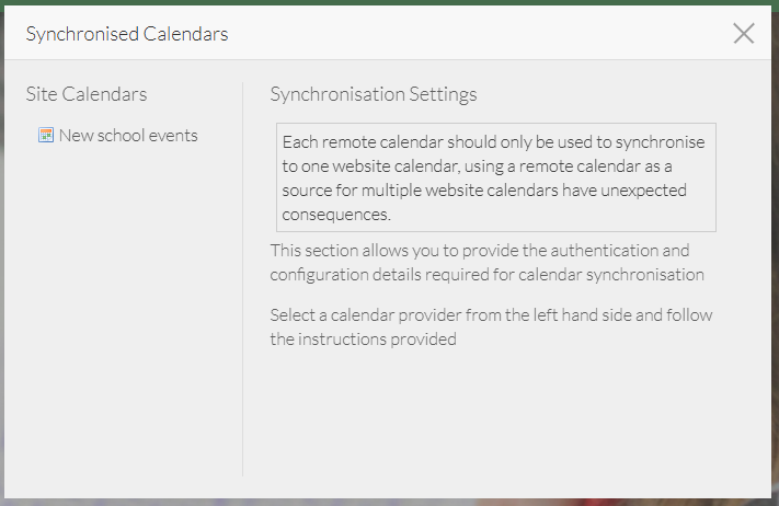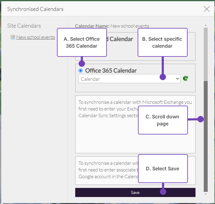 This feature pushes the content of your Microsoft Outlook calendar to your website calendar. Any changes made to the website calendar will not be synchronised to your school's Microsoft Outlook calendar.