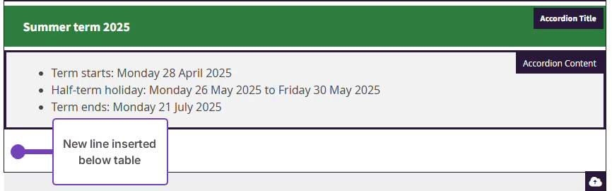 A line of text will be inserted below your accordion. You can now enter your content below the accordion: