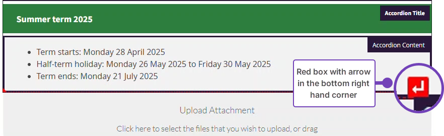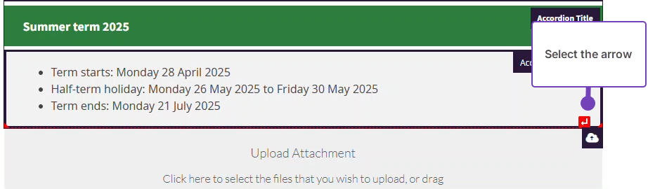 - Hover your mouse toward the bottom of the accordion. A red box with an arrow will appear: