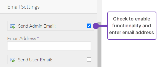- Check Send Admin Email: to enable the functionality and enter/update Email Address*: