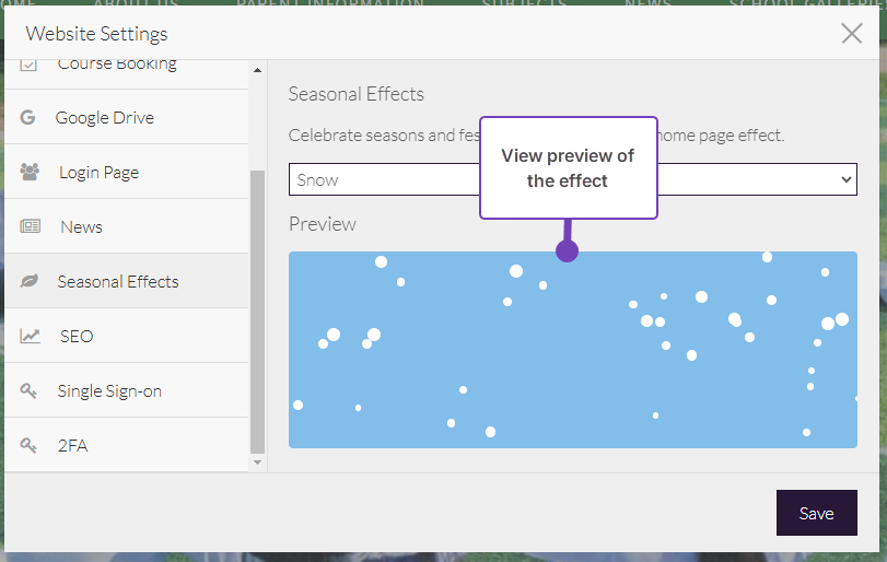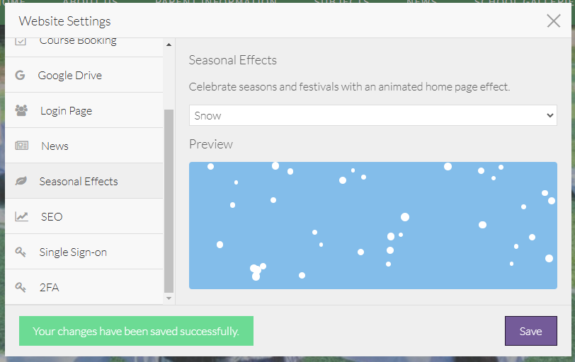 Preview the effect in the Preview pane: - Select Save. The Seasonal Effect is added to your website and a confirmation message is displayed: