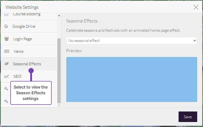 - Scroll through the Website Settings and select Seasonal Effects:
