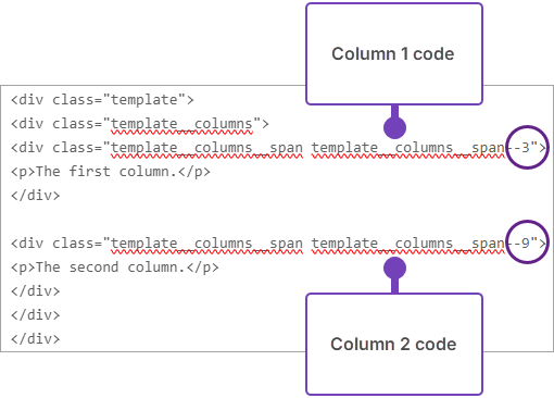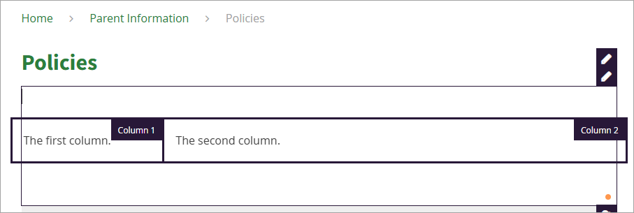 The column widths will resize based on the changes you made to the source code. In this example, Column 1 spans a quarter of the page width (3) and Column 2 spans three-quarters (9) of the page width (12):